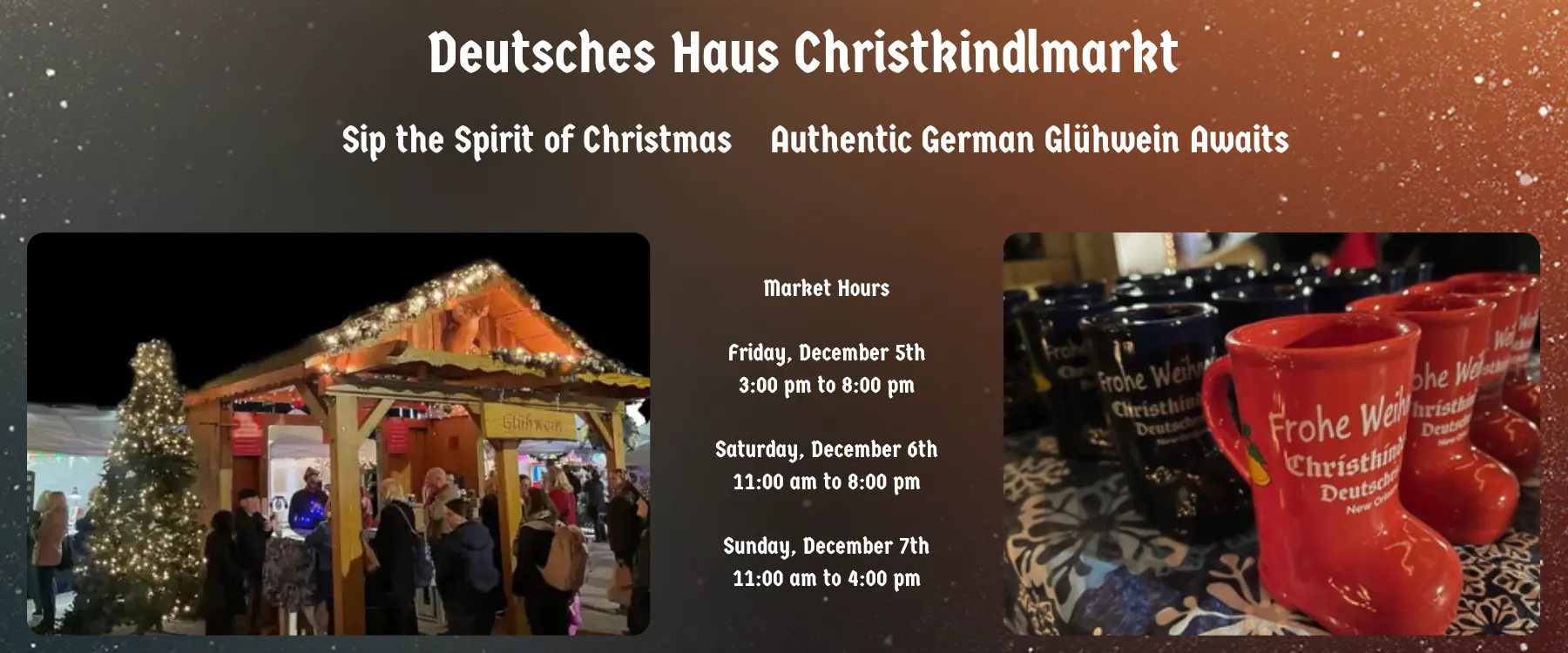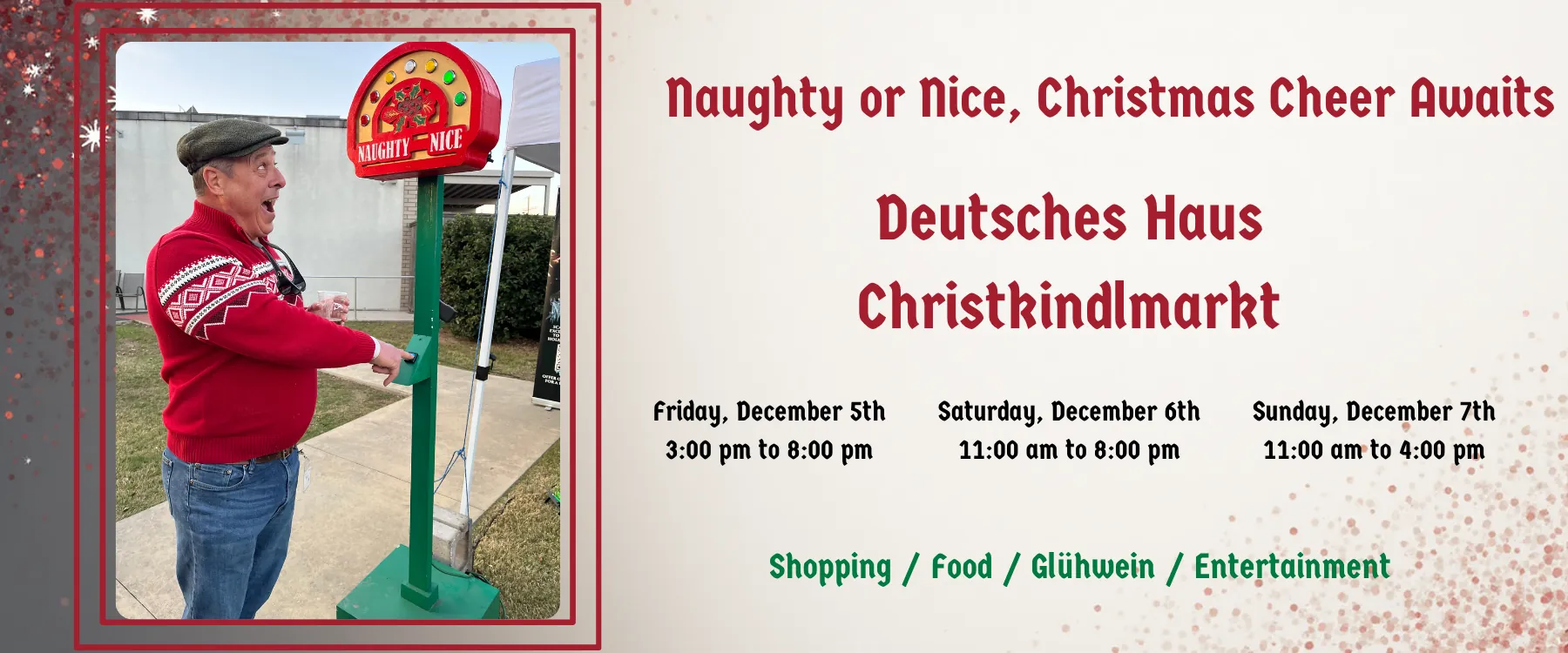 50DHFront1920x1024.jpegWillkommen! Willkommen! 2025 Naughty or Nice 1800x7502025 Christkindlmarkt kids 1800x7502025 Christkindlmarket Band 1800x.7502025 Gluhwein 1800x750 Current Events Kino - Stasi Komö Die Tuesday, November 11, 2025 7:30 PM Free and Open to the Public Coming to America Lecture Series Sunday, November 16, 2025 2:00 PM Free and Open to the Public Kulturabend Tuesday, November 18, 2025 7:00 PM Free and Open to the Public Kino - Nena Tuesday, November 25, 2025 7:30 PM Free and Open to the Public Haus Closed - Thanksgiving Day Thursday, November 27, 2025 CLOSED Trivia Night Friday, November 28, 2025 7:00 PM Free and Open to the Public Haus Christmas Party Saturday, November 29, 2025 1:00 PM Click to Register/Pay 12 & UP $25 / Children Free Remembrance Day Sunday, November 30, 2025 2:00 PM Free and Open to the Public Christkindlmarkt Friday, December 5, 2025 - Sunday, December 7, 2025 Fri 3-8pm, Sat 11am-8pm, Sun 11am-4pm Quarterly General Membership Meeting Friday, December 12, 2025 7:00 pm - 10:00 pm Members Only Get Involved Damenchor & Saengerchor Choir Friday, November 7, 2025 Damenchor 7:00 pm & Saengerchor 8:00 pm Wander Gruppe Thursday, November 13, 2025 5:30 pm - 8:30 pm Schlaraffia Thursday, November 13, 2025 7:00 pm - 9:00 pm Galvez Night Friday, November 14, 2025 7:00 pm - 10:00 pm Liederkranz Thursday, November 20, 2025 7:00 pm - 8:00 pm Damenchor & Saengerchor Choir Friday, November 21, 2025 Damenchor 7:00 pm & Saengerchor 8:00 pm Ladies Auxiliary Meeting Thursday, December 4, 2025 7:00 pm - 8:00 pm
